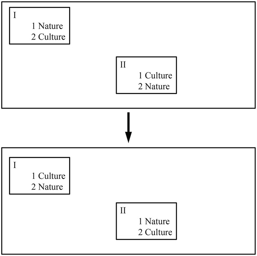 Figure 3.3 Two versions of the tangled hierarchy between nature and culture. Inverting the hierarchy (from the top to the bottom version) does nothing to solve the problem of the opposition of the two concepts.
