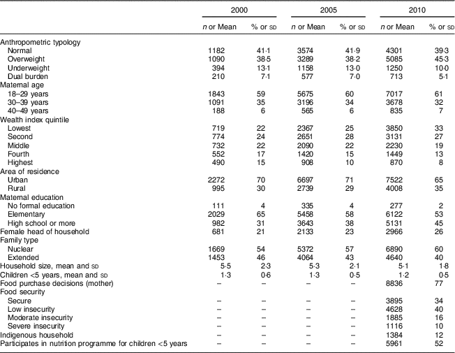 The goal of the present study was to assess several maternal and familial determinants of the different anthropometric typologies in the nutrition transition at the household level in 2000, 2005 and 2010. Variables included in the analyses were selected according to existing evidence from Colombia( Reference Parra, Iannotti and Gomez 15 , Reference Garcia, Sarmiento and Forde 16 , Reference Borda 18 , Reference McDonald, Baylin and Arsenault 19 , Reference Isanaka, Mora-Plazas and Lopez-Arana 24 – Reference Dufour, Bender and Reina 26 ). For the year 2010, we were also able to examine additional variables introduced that year, including the correlation between purchasing decisions at the household level, participation in government-subsidized nutrition programmes for children younger than 5 years, indigenous households and food security.