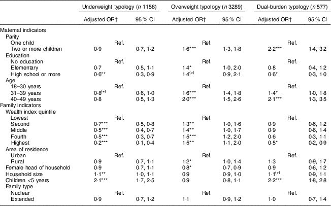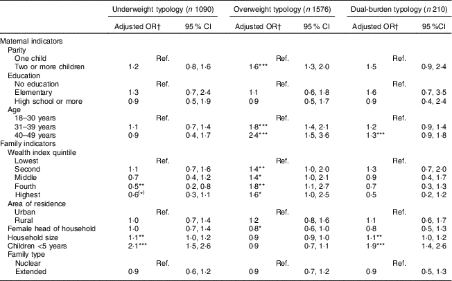 As shown in Table 2, families in the second-highest wealth category (OR=0·5; 95 % CI 0·2, 0·8) were less likely to be classified as underweight typology compared with normal typology. Parity (two or more children: OR=1·6; 95 % CI 1·3, 2·0) and maternal age (31–39 years: OR=1·8; 95 % CI 1·4, 2·1; 40–49 years: OR=2·4; 95 % CI 1·5, 3·6) were associated with the prevalence of overweight anthropometric typology compared with normal typology. The second (OR=1·4; 95 % CI 1·0, 2·0), third (OR=1·4; 95 % CI 1·0, 2·1), fourth (OR=1·8; 95 % CI 1·1, 2·7) and fifth (OR=1·6; 95 % CI 1·0, 2·5) wealth index categories were positively associated with the likelihood of being classified in the overweight typology compared with normal typology. The larger the household size (OR=1·1; 95 % CI 1·0, 1·2) and the greater the number of children younger than 5 years (OR=1·9; 95 % CI 1·4, 2·6) residing in the house, the greater the likelihood to be classified in the dual-burden typology.