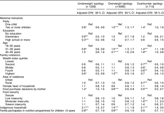 As shown in Table 4, maternal parity of two or more children (OR=0·8; 95 % CI 0·6, 0·9) was negatively associated with the likelihood of being classified in the underweight typology compared with normal typology. High school or more maternal education (OR=0·3; 95 % CI 0·2, 0·6) was associated with a lower likelihood of being classified as an underweight household. Families in the highest wealth index category (OR=0·6; 95 % CI 0·3, 0·9) were less likely to be classified as an underweight household compared with normal households. Homes where food purchasing decisions were made by the mother (OR=1·2; 95 % CI 1·0, 1·5) were more likely to be classified as an underweight household. Households classified as indigenous (OR=2·1; 95 % CI 1·5, 2·7) were more likely to be classified in the underweight typology.