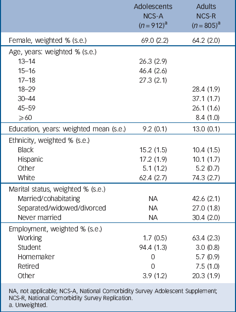 | Adolescents NCS-A (n = 912) a | Adults NCS-R (n = 805) a | |