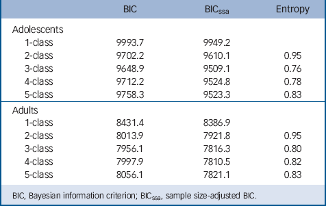 Latent class analyses were performed using Mplus version 6.1 for Windows. Reference Muthén and Muthén39 In LCA it is assumed that an unobserved, latent categorical variable (i.e. class) explains the association among a set of observed variables (i.e. symptoms). It computes two sets of parameters: latent class probabilities or prevalences, and conditional probabilities (estimated probabilities of observed variables given that the individual is a member of that class). Ten categorical variables measuring depressive symptoms (as described earlier) served as latent class indicators, and models with one to five classes were estimated. The final model was chosen based on the Bayesian information criterion (BIC, smallest value preferred), the sample size-adjusted BIC (smallest value preferred), entropy (highest value preferred) and interpretability of the derived classes. Reference Nylund, Asparouhov and Muthen40–Reference Neuman, Todd, Heath, Reich, Hudziak and Bucholz42 Respondents were assigned to their most likely class based on posterior probabilities, classes were given subjective labels based on symptom probabilities, and correlates of classes were then evaluated in SAS version 9.2 (SAS Institute, Cary, North Carolina, USA) for Windows, separately for adolescents and adults. Class comparisons within samples were performed for correlates with a significant main effect (P<0.05), and further post hoc tests examined differences between NCS-A and NCA-R classes. All analyses corrected for the complex sampling design and were weighted to adjust for differential probabilities of selection, non-response and post-stratification.