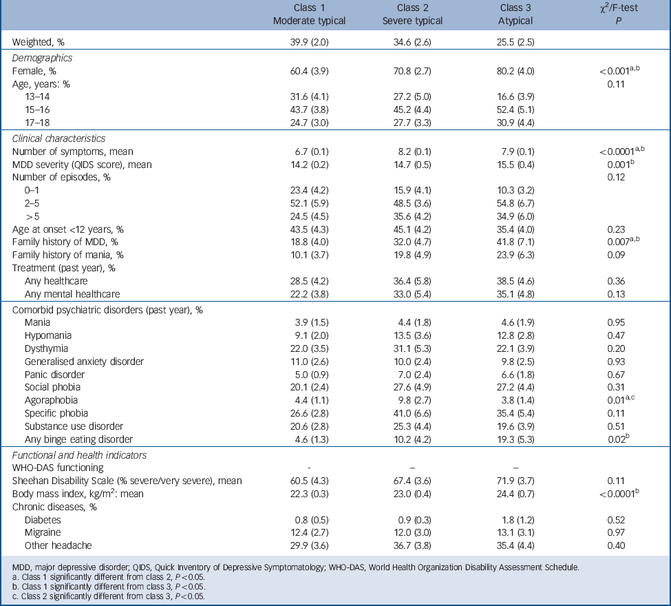 Several similarities were observed between the adolescent and adult samples. In both samples the proportion of female participants was highest in the atypical class and was similar across samples (P = 0.88). In both samples the number of symptoms was highest in the severe typical class and the symptom severity score was highest in the atypical class. Comparisons of similar classes between adolescents and adults revealed no significant difference in number of symptoms and symptom severity between classes (data not shown). In both samples, BMI was highest in the atypical class, and there was no observed difference in chronic conditions. There were, however, several differences in correlates between the adolescent and adult samples: differences in number of episodes, age at onset and treatment between classes were observed only in the adult sample.