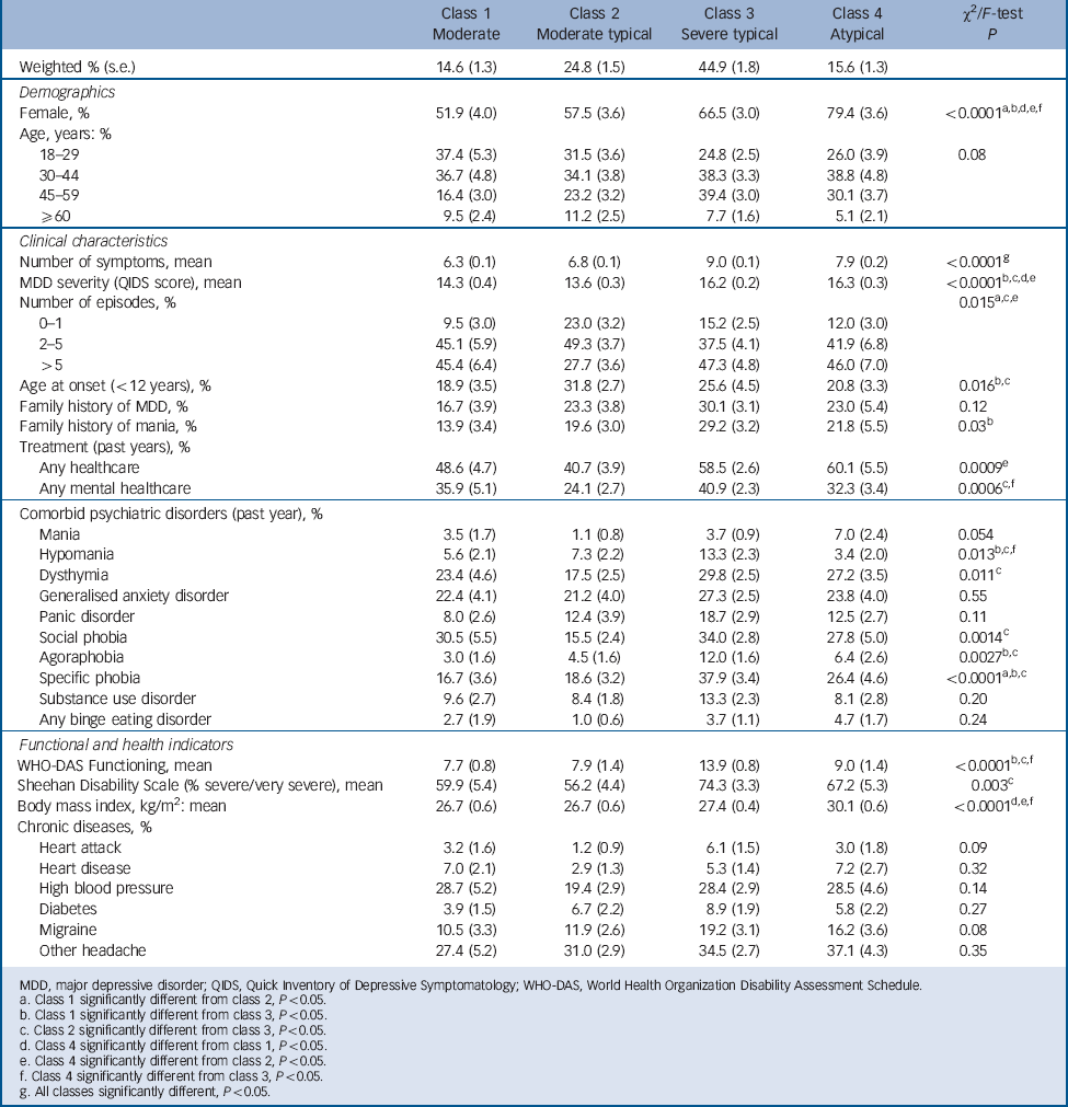 Body mass index significantly differed across adult classes, with the atypical class having a significantly higher BMI than all other classes and also having the highest percentage of people with a BMI greater than 25 kg/m Reference Cole, Tram, Martin, Hoffman, Ruiz and Jacquez2 (77.6% v. 54.2–59.2% in other subtypes). The WHO-DAS health functioning scale further showed highest disability in the severe typical class. Severity of the severe typical class was also distinguished by disability, with