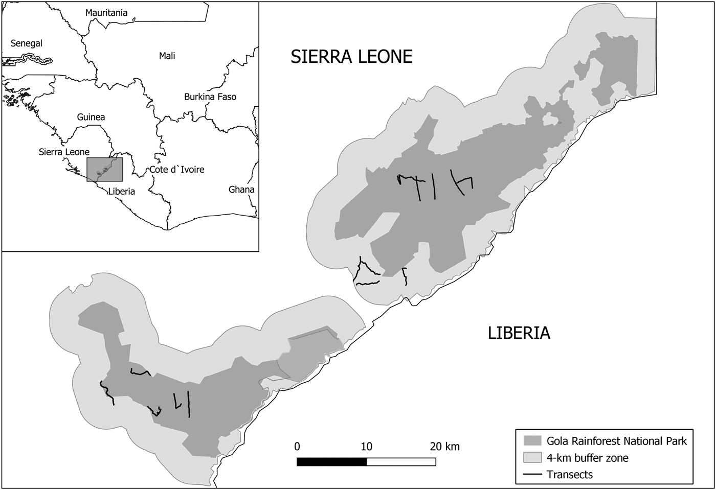 Gola Rainforest National Park (Fig. 1) is dominated by lowland moist evergreen high forest, with an annual rainfall of c. 3,000 mm, mostly falling in a single wet season from May to October (Lindsell et al., Reference Lindsell, Klop and Siaka2011). The Park currently consists of two main forest blocks (Gola South, c. 260 km2, and Gola Central, c. 386 km2) and a smaller sector (Gola North, c. 54 km2), surrounded by a 4-km buffer zone (c. 770 km2). Formal agreements with most of the local chiefdoms in the buffer zone support small-scale agriculture, agroforestry and other local livelihood activities aimed at reducing intensive exploitation of the forest. However, illegal gold and diamond prospecting, plus potential concessions to oil palm companies, are an ongoing threat (BirdLife International, 2018a).