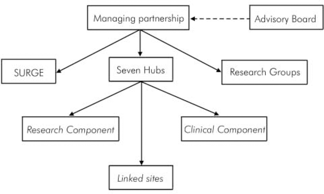 The MHRN is a managed network and its structure is shown in Figure 1. It brings together researchers and providers of mental health and social care services. The MHRN hosts, but does not fund research. Its strategy is supported by an advisory group that has representatives from Department of Health Funding agencies as well as academics and service users.