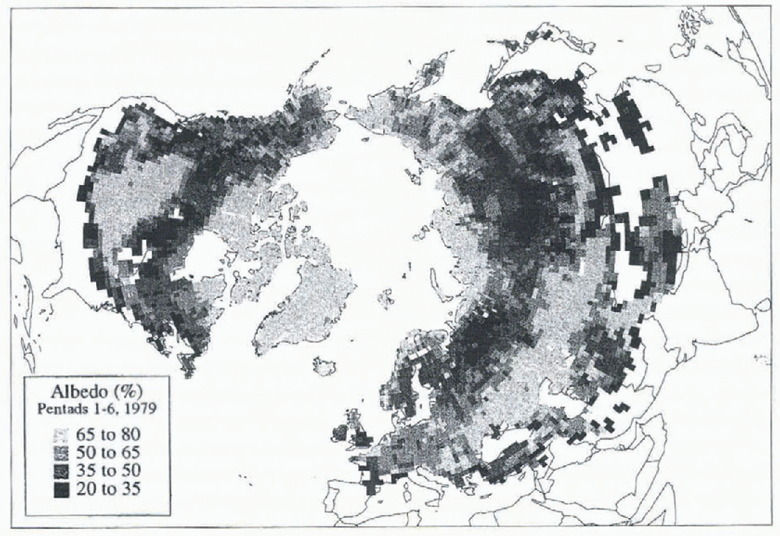 Albedo estimates over snow-covered lands during the first six pentads of 1979 are shown in Figure 1. In this example, any cell that was snow covered during at least one pentad of this interval is assigned an albedo by averaging the cell values for the six pentads. Albedos >50% are observed in the fully snow-covered steppe, plains and prairie of the middle latitudes, as well as over high-latitude tundra. Lower albedos between these two zones are a function of trees within the boreal forests masking the underlying snow-covered ground. Values within the periphery of the snow-covered region (snow transition zone), despite often being in non-forested areas, are commonly > 50%, as snow did not cover the ground throughout the six pentads.