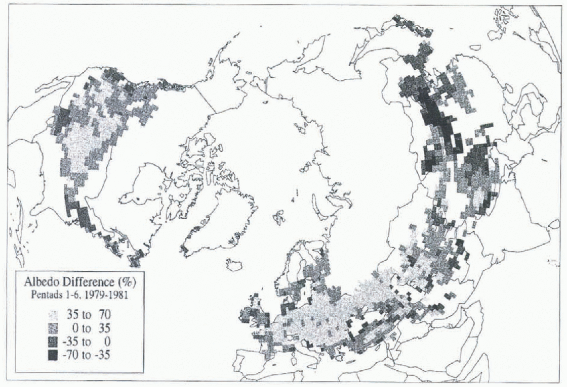 According to the NOAA visible charts, snow cover during the first six pentads of 1979 was at a maximum for the 1972–96 interval. When compared to the albedos calculated for this interval in 1981, when snow cover was at a minimum, large differences in albedo are observed (Fig. 2). In many areas of the United States and western Eurasia, the 1979 albedos exceeded those in 1981 by 35% or more (although, as discussed below, 1981 European snow cover was apparently underestimated in the visible charts). Much more extensive 1981 cover in lightly vegetated areas of eastern Asia resulted in 1979 albedos in this region being as much as 35–70% lower than in 1981.