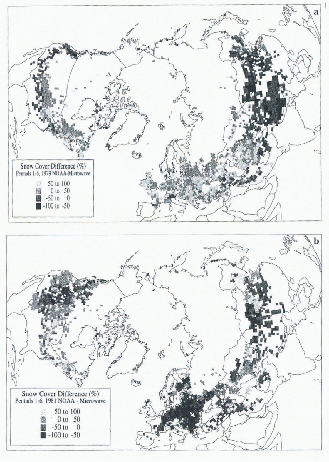 Estimates of the spatial extent and the depth of a snow pack may be calculated using measurements in multiple microwave channels. A file based on these analyses is another component of the new integrated dataset. This file includes Scanning Multichannel Microwave Radiometer (SMMR) snow estimates, based on the algorithm of Reference Chang, Fosterand and HallChang and others (1987), for 1979 through mid 1987. and Special Sensor Microwave Imager (SSM/I) estimates, derived from the algorithm of Reference Grody and BasistGrody and Basist (1996), for most years since 1987. The discrimination of dry snow cover and depth using microwave data is possible mainly because of differences in emissivily between snow-covered and snow-free surfaces. Differences in microwave scattering between snowpacks are generally a function of snow mass (expressed as depth or water equivalent), although other factors, such as ice layers within the pack or depth hoar at the base, also affect scattering. Vegetation penetrating through the pack also influences microwave signals reaching the satellite sensor, making estimates of snow difficult in forested regions. It is difficult to map wet snow extent. For the new microwave file, the SMMR and SSM/I products have been converted to pentads and to a 1 × 1° grid using GlS techniques.