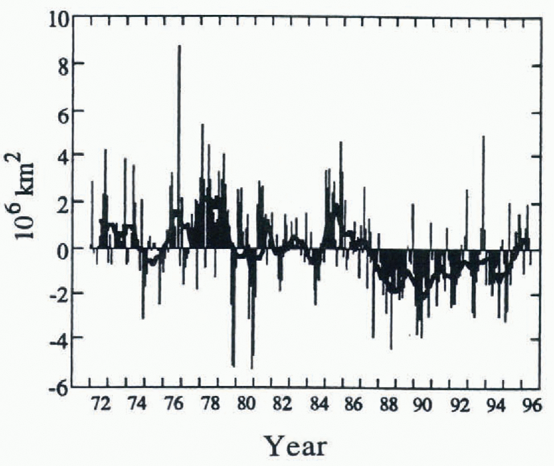 Fig. 4. Anomalies of monthly snow-cover extent over. Northern Hemisphere lands (including Greenland) between January 1972 and Angust 1996. Also shown are 12 month running anomalies of hemispheric snow extent, plotted on the seventh month of a given interval. Anomalies are calculated from NOAA visible charts. Mean hemispheric snow extent is 25.3 × 106 km2 fir the full period of record (see Reference RobinsonRobinson, (1993a) for a discussion of the Rutgers method used to calculate monthly snow cover).