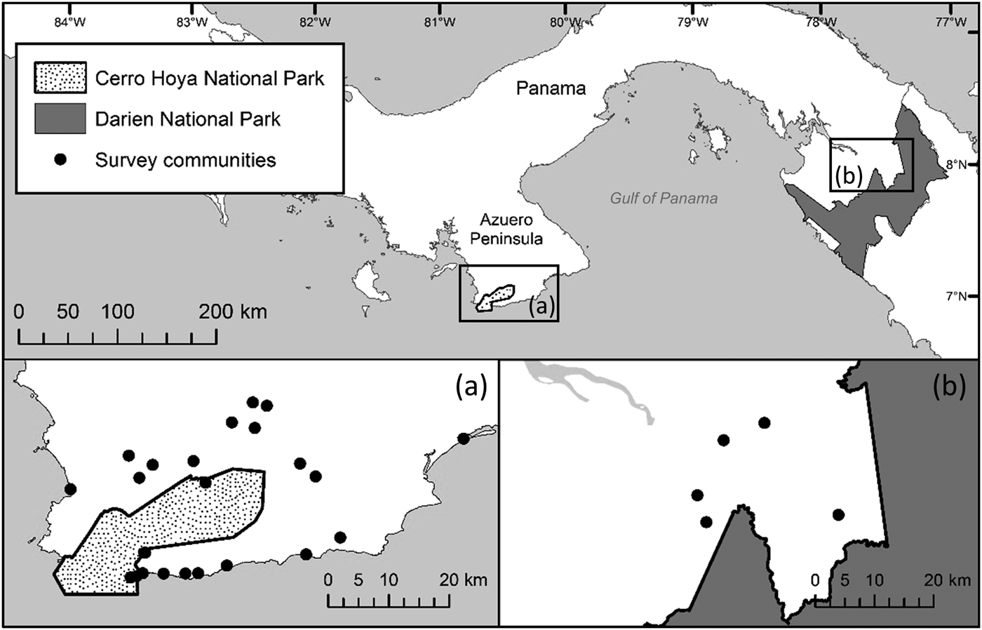 Fig. 1 Communities in and around (a) Cerro Hoya National Park and (b) Darién National Park, Panama, surveyed during 2014–2015 to investigate their attitudes towards jaguars Panthera onca and National Park conservation.