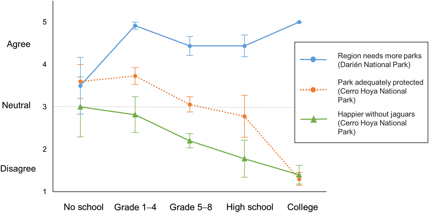 Fig. 2 Mean Likert response scores (1 = strongly disagree, 5 = strongly agree), with standard error bars, to knowledge and belief statements regarding jaguars and conservation of National Parks, according to level of education of respondents in communities in and around Cerro Hoya and Darién National Parks, Panama (Fig. 1), in surveys conducted during 2014–2015. Only significant results are shown.