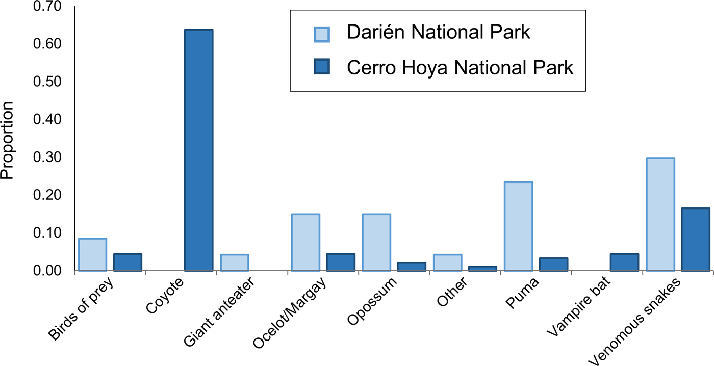 Pumas were the second most commonly reported threat to livestock (after venomous snakes) in Darién, but only 3% of respondents reported them as being a threat in Cerro Hoya, where communities and ranches are less frequently located near suitable habitat for pumas. The majority of respondents in Cerro Hoya reported coyotes as being a major threat to livestock, whereas there were no reports of such a threat in Darién. Although the distribution of coyotes in Panama is not known precisely, it has expanded as far east as Darién Province (Méndez-Carvajal & Moreno, Reference Méndez-Carvajal and Moreno2014) and as far south as the Azuero Peninsula (Fort, Reference Fort2016), with a significant impact on people reported from Los Santos Province (Bermúdez & González, Reference Bermúdez and González2013). This relatively recent and rapid expansion of coyotes into the Azuero Peninsula could have implications for livestock owners, in addition to introducing novel predation pressures on native prey species that are already isolated and heavily poached.
