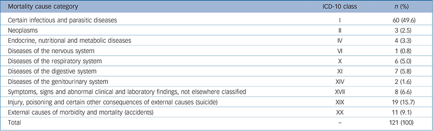 The commonest cause of death, based on categories of the ICD-10, 32 was related to infectious conditions (49.6%, n = 60) prevalent in the study area (Table 3). Unnatural causes accounted for a quarter of all causes of death (24.8%, n = 30), most arising from suicide (n = 19, 15.7%); the rest from other unnatural causes such as road traffic accidents and homicide (n = 11). Proportionately, those with bipolar disorder had the highest mortality from suicide (24.2%, n = 8/33) although the difference