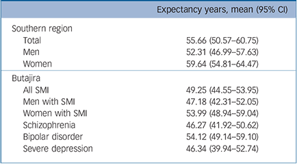 Table 4 Life expectancy at birth (with 95% CI) of people with severe mental illness (SMI) computed based on the general population of the region