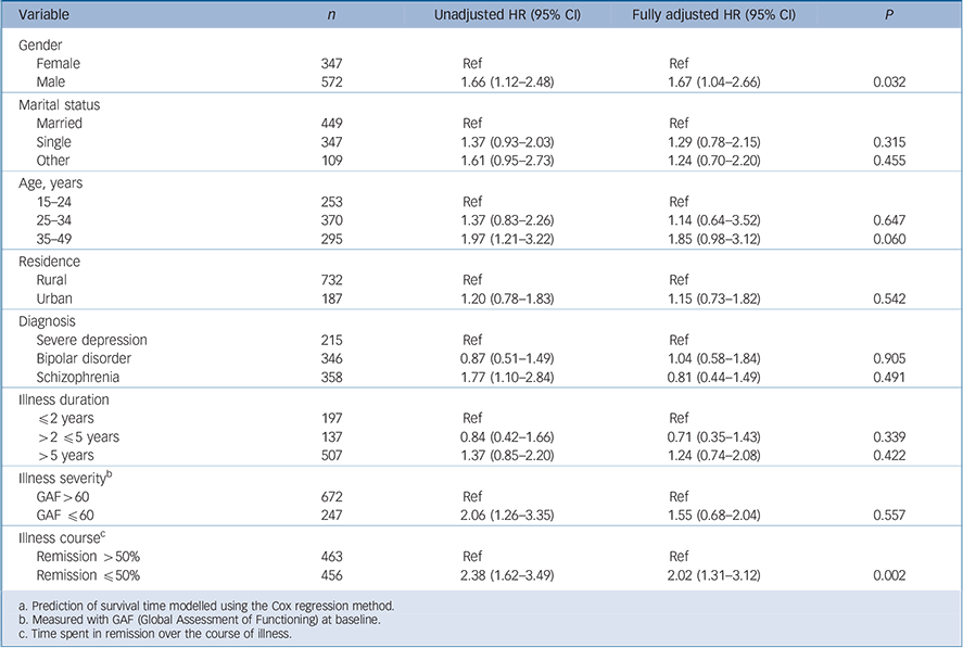 a. Survival analysis using the Cox Regression model – fully adjusted for age, gender, marital status, residence, diagnosis, functioning and symptomatic status at baseline, and duration of illness at recruitment.