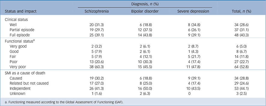 In the month prior to death, most of the deceased were symptomatic (70.2%, n = 85/121) and functionally impaired (75.2%, n = 91/121) because of their mental illness (Table 7). Impairment was consistently high across diagnostic groups: schizophrenia (78.5%), bipolar disorder (75.8%) and severe depression (65.3%). Similarly, high percentages of the deceased were symptomatic across the diagnostic groups: schizophrenia (n = 44, 68.8%); bipolar disorder (n = 26, 78.8%) and severe depression