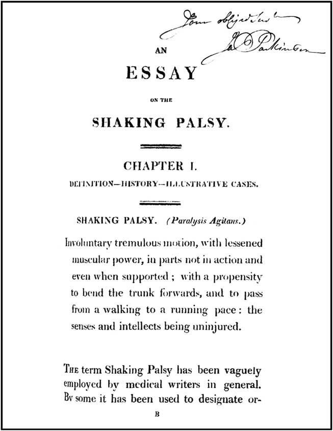 The London surgeon-apothecary James Parkinson is still remembered today essentially because of the short monograph entitled An Essay on the Shaking Palsy that he published in 1817.Reference Parkinson 1 This work, the only contribution that Parkinson made to neuroscience, became a classic of the medical literature because it describes, for the very first time, paralysis agitans as a distinct nosological entity. His remarkably precise description: “Involuntary tremulous motion, with lessened muscular power, in parts not in action and even when supported; with a propensity to bend the trunk forwards, and to pass from a walking to a running pace: the senses and intellects being uninjured,” which has stood the test of time, testifies to Parkinson’s keen sense of observation as well as to its power of merging various neurological symptoms into a single clinical entity (Figure 1). Despite some positive reports that appeared in the English medical literature shortly after the publication of Parkinson’s essay, the work remained relatively ignored until the celebrated French neurologist Jean-Martin Charcot (1825-1893), who worked at la Salpêtrière in Paris, rediscovered it some 50 years after its publication.Reference Gardner-Thorpe and James 2 Based on his clinical observations of the disease, Charcot proposed changing the terms shaking palsy/paralysis agitans for that of La maladie de Parkinson, but the English neurologists took a long time to accept the term Parkinson’s disease, which is more than familiar to all of us today.