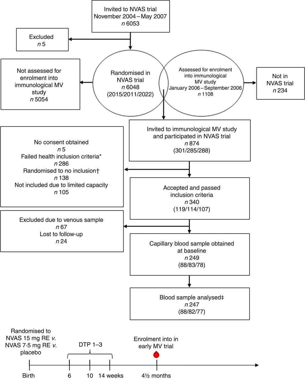 Fig. 1 Flow chart of participants and timeline of studies. Numbers in parentheses indicate the number of infants randomised to either of the three treatment arms: 30mg retinol equivalents (RE) (50000 IU vitamin A)/7·5mg RE (25000 IU vitamin A)/placebo. NVAS, neonatal vitamin A supplementation; MV, measles vaccine; DTP, diphtheria–tetanus–pertussis vaccine;