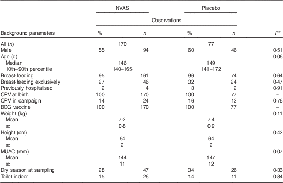 In total, the study included 247 infants, who enrolled in both the NVAS RCT and in the immunological MV sub-group study to the early MV trial (Fig. 1). The infants included in the present analysis only represent a fraction of the participants in the NVAS trial. To assess whether a particular selection of the cohort had taken place, we therefore compared background characteristics of the herein analysed infants with the participants enrolled in the NVAS trial during the same period, but not included in the present study. There were only very subtle differences between the analysed infants and the non-analysed infants, the former being slightly smaller (online Supplementary Table S2), and, importantly, of the analysed infants, the NVAS and placebo groups were similar with respect to characteristics presented in Table 1, which could influence the immune system at the age of 4–6 months (Table 1).