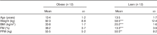 As shown in Table 1, the two groups (obese and lean) were matched for age (13·4 (sd 1·2) and 13·5 (sd 1·7) years old, respectively). As expected, the obese adolescents had a significantly higher body weight, BMI, fat mass percentage and fat-free mass compared with the lean adolescents (P<0·001).