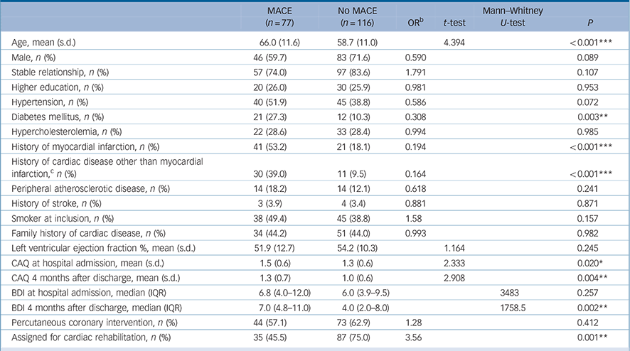 During a mean follow-up period of 4.2 years (s.d. = 2.0) (range 0–6.6 years), 77 (39.9%) of 193 patients had a MACE after baseline. A total of 36 of them (46.8%) died. During a mean follow-up period of 4.3 years (s.d. = 1.7) (range 0–6.0 years), 67 (35.4%) of 189 patients had a MACE after the 4-month CAQ assessment. A total of 32 of them (47.8%) died. Patients who had an event during the follow-up period were older (P<0.001), had higher CAQ scores at baseline (P = 0.020) and 4 months after the index myocardial infarction (P = 0.004), had higher BDI scores at 4 months after the index myocardial infarction (P = 0.002), were more likely to have a history of myocardial infarction and cardiac disease other than myocardial infarction (P<0.001), or diabetes mellitus (P = 0.003) and were less likely to be assigned to cardiac rehabilitation (P = 0.004) (Table 1).