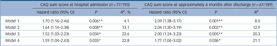 Model 1: unadjusted; Model 2: adjusted for age and gender; Model 3: Model 2 + left ventricular ejection fraction and history of myocardial infarction, and hospital readmissions between the index event and CAQ assessment 4 months after discharge in the model evaluating hazard ratio at 4 months; Model 4: Model 3 + transformed Beck Depression Inventory score at the same time as CAQ assessment (i.e. baseline or 4 months after discharge respectively).
