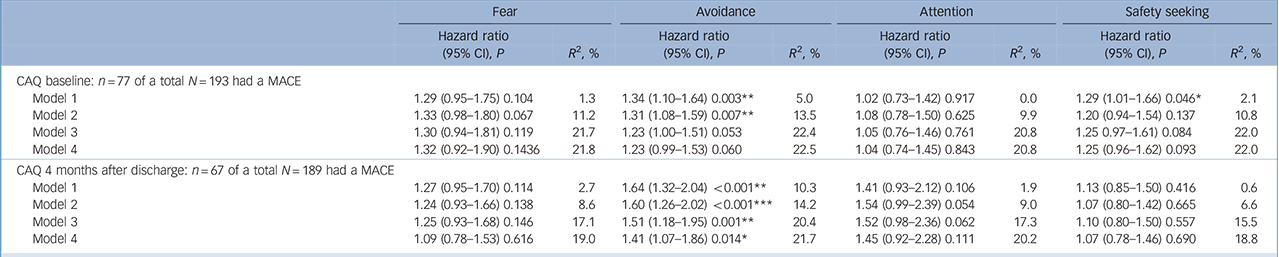 Table 2 Hazard ratios (95% CI) for a major adverse cardiac event (MACE) associated with scores on the Cardiac Anxiety Questionnaire (CAQ) during admission to hospital and at 4 months after discharge a