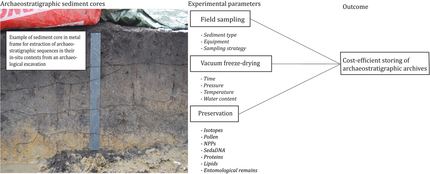Archaeological excavations and palaeoclimate field studies are often costly, long-term and complex endeavours. One strategy is to extract sediment cores to accommodate the requirements of present and future in-depth analyses (Figure 1). This method, however, leaves excavation leaders, museums and universities with large quantities of sediment cores for storage (Harrison et al. Reference Harrison, Bartolini, DeSilvey, Holtorf, Lyons, Macdonald, May, Morgan and Penrose2016). As air-dried sediments will lose important physical properties, the prevailing procedure is to store sediment cores in cold stores. As an example, air-filled palynomorphs (microscopic plant and animal structures) tend to collapse under uncontrolled dehydration in ambient conditions (Fægri et al. Reference Fægri, Kaland and Krzywinski1989). Long-term storage in cold stores also results in the slow drying of the sediment and/or fungal growth on and inside the cores, as well as changes in biochemistry, bacteriology and bulk carbon properties (Clark & Hirsch Reference Clark and Hirsch2008). The latter especially can bias radiocarbon dates, and NPP (non-pollen palynomorph) and sedaDNA (sedimentary ancient DNA) analysis. As a result, comparative studies have revealed that freezing is more suitable for long-term storage of environmental samples (Sun et al. Reference Sun, Cai, Chang and Bhatti2015). Freezing is, however, not sufficient to preserve all organic properties, even with fast nitrogen-freezing (Thieme et al. Reference Thieme, Graeber, Kaupenjohann and Siemens2016); when frozen uncontrolled drying will still occur. Therefore, new solutions are urgently needed.