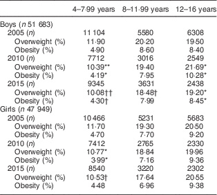 Cross-sectional analysis (n 99 632) of the overweight and obesity prevalence rates for boys (n 51 683) and girls (n 47 949) for the years 2005, 2010 and 2015 separately for each age group (4–7·99, 8–11·99 and 12–16 years). The number of subjects for each age group and year is also given.