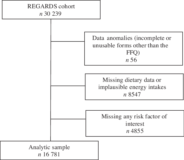 Of the 30 239 participants, fifty-six had data anomalies (incomplete or unusuable forms, other than the FFQ, due to being damaged), 8547 (28 %) had missing dietary data or implausible energy intakes and 4855 (16 %) were missing risk factors of interest, leaving an analytical sample of 16 781 participants (Fig. 1). Among these participants, 34·6 % were black, 45·6 % male, 55·2 % resided in stroke belt region and the average age was 65 years. Online Supplementary Table S1 provides demographic characteristics of included and excluded participants. Briefly, those excluded were more likely to be black, have a high school education or below, have an income of <$75 K/year, live in a food desert and reside in a disadvantaged neighbourhood.