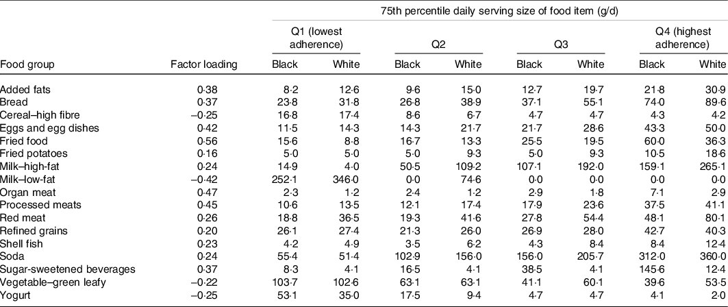 Stratification of daily intake for food groups making up the Southern dietary pattern allowed for observation of racial differences in dietary intake (Table 1, online Supplementary Table S2). Black participants in the highest quartiles of Southern pattern adherence consumed higher amounts of fried foods, organ meats and sugar-sweetened beverages compared with white participants. Fried food intake in black participants in the fourth quartile was close to double the intake in white participants (60 g/d v. 36 g/d, respectively). Consumption of organ meats (liver, gizzard, neckbones and chitlins) for black participants in the fourth quartile was triple the intake of white participants (7·1 g/d v. 2·9 g/d, respectively). Sugar-sweetened beverage intake among black participants in the highest quartile of Southern dietary pattern adherence was 145·6 g/d and 12·4 g/d for white participants. White participants in the highest quartile of Southern dietary pattern adherence reported higher consumption of high-fat milk and red meat. High-fat milk intake for white participants was 265 g/d (approximately 1 cup) and 160 g/d for black participants (approximately 0·68 cups). White participants in the highest quartile of adherence consumed almost double the amount of red meat compared with black participants (80 g/d v. 48 g/d, respectively).