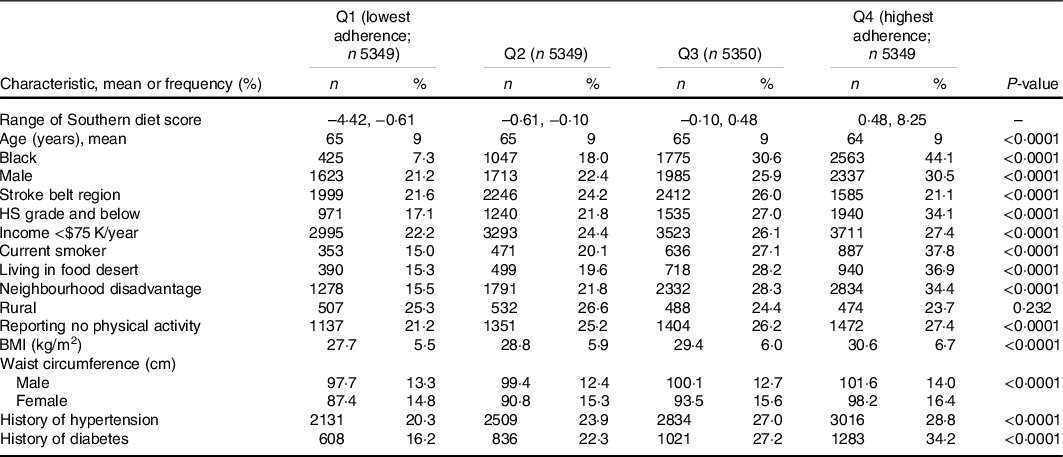 Baseline characteristics of participants by quartile of Southern diet score are shown in Table 2. Those least adherent to the Southern dietary pattern appear in the first quartile, while those most adherent in the fourth quartile. The following characteristics were associated with greater adherence to the Southern diet pattern: black race, male sex, residence in stroke belt region, lower education level, lower income, current smoker, residence in a food desert, living in a disadvantaged neighbourhood, physical inactivity, higher BMI, higher waist circumference, history of hypertension and history of diabetes (P < 0·0001). Residence in a rural region was the only covariate not associated with Southern diet score (P = 0·23).