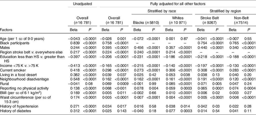 * As the Southern diet score is a standardised factor (mean of 0·0, sd of 1·0), beta coefficients can be interpreted as the number of standard deviation difference associated with the factor (i.e. between groups for dichotomous predictors and per standard deviation for continuous predictors). Fully adjusted model adjusts for all other variables.
