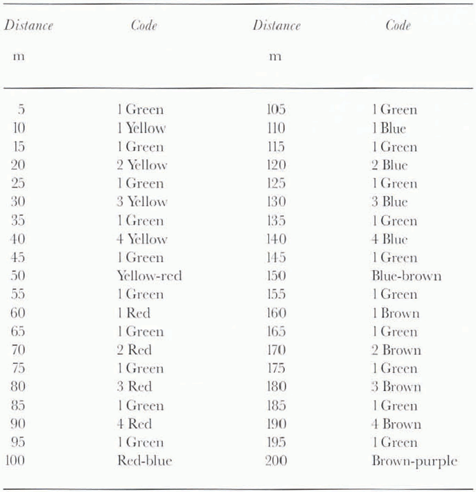 A practical system of labelling lengths on cables has been devised using multiple bands of coloured PVC electrical tape. In our experience, this seems to optimise readability, robustness and simplicity. The tape is attached in two or three turns onto alcohol-cleaned cable. Extra security can be obtained by sliding a sleeve of polyolefin heat-shrink tubingalong the cable, cutting off and shrinking a 5 cm piece over the tape. The distance is read at the midpoint of the tape cluster. Intermediate distances are measured with a 3 m pocket tape and marked (if necessary) with white or black tape.