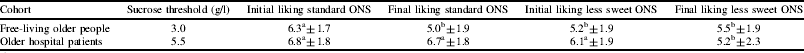 Mean liking scores of the free-living cohort for the standard ONS decreased significantly (P<0.0001) following repeat consumption. Their liking of the reduced sweetness variant was significantly lower initially (P=0.03), and the liking of this product did not alter following 60 ml consumption. Within the hospital cohort, repeat consumption caused a significant decrease in liking of the reduced sweetness product (P=0.02), but not of the standard ONS. Sweetness thresholds differed significantly (P<0.001) between the cohorts, with older patients having a higher mean threshold. Data from the two cohorts were pooled and threshold was compared to both age (below or above 80) and cohort group. Age class did not have a significant effect on threshold, whereas the effect of cohort group was significant (P<0.05). Sweet thresholds did not correlate to liking of the sweet or less sweet ONS variants.