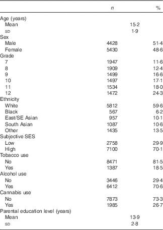 Covariates included demographics, subjective socio-economic status (SES), parental education level and substance use. Demographics included age (measured in years), sex (females coded 1) and ethnicity. Ethnicity was assessed using responses to a question asking students to select one or more categories that best described their ethnic background. The categories listed were similar to those used in the 2006 Canadian Census( 30 ). Students who selected only one ethnic background were grouped into five categories including white (coded 0), black (coded 1), East or Southeast Asian (coded 2), South Asian (coded 3) and other (coded 4). Students who selected multiple ethnic backgrounds were coded as other.