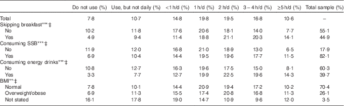 Table 2 Prevalence of time spent using social networking sites (SNS) by unhealthy eating behaviours and body weight statusFootnote † (Percentages; n 9858)