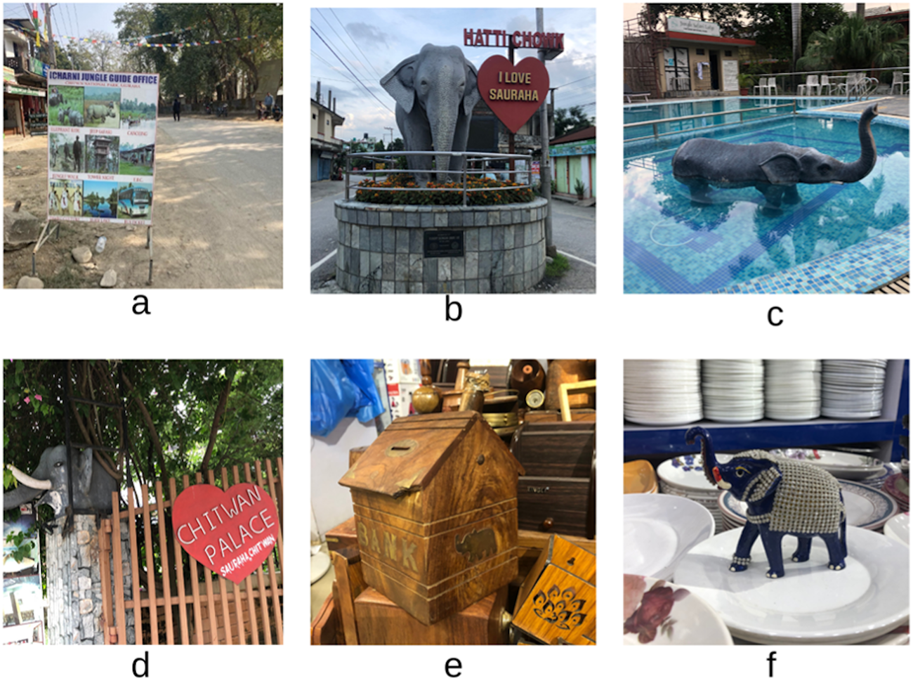 In this section, I address my first research question and argue that neoliberal conservation in Sauraha is enacted when tourism stakeholders intervene in both material and digital spaces through signs, texts, and objects imbued with rich indexical meanings that highlight the elephant’s economic potential. Here I find it useful to draw on Shankar & Cavanaugh (Reference Shankar, Jillian, Jillian and Shankar2017:2) and others who argue that integrating language and materiality in analysis helps us understand how meaning and value are produced, while also shedding light on how ‘language is embedded within political economic structures and relations’. I start with the analysis of how the tourist town engages with the elephant through representational discourses and material semiotics. I then pay special attention to how local tourism stakeholders navigate tensions created by the commodity value of wildlife tourism on the one hand and the discourses of ethical tourism and wildlife conservation on the other.