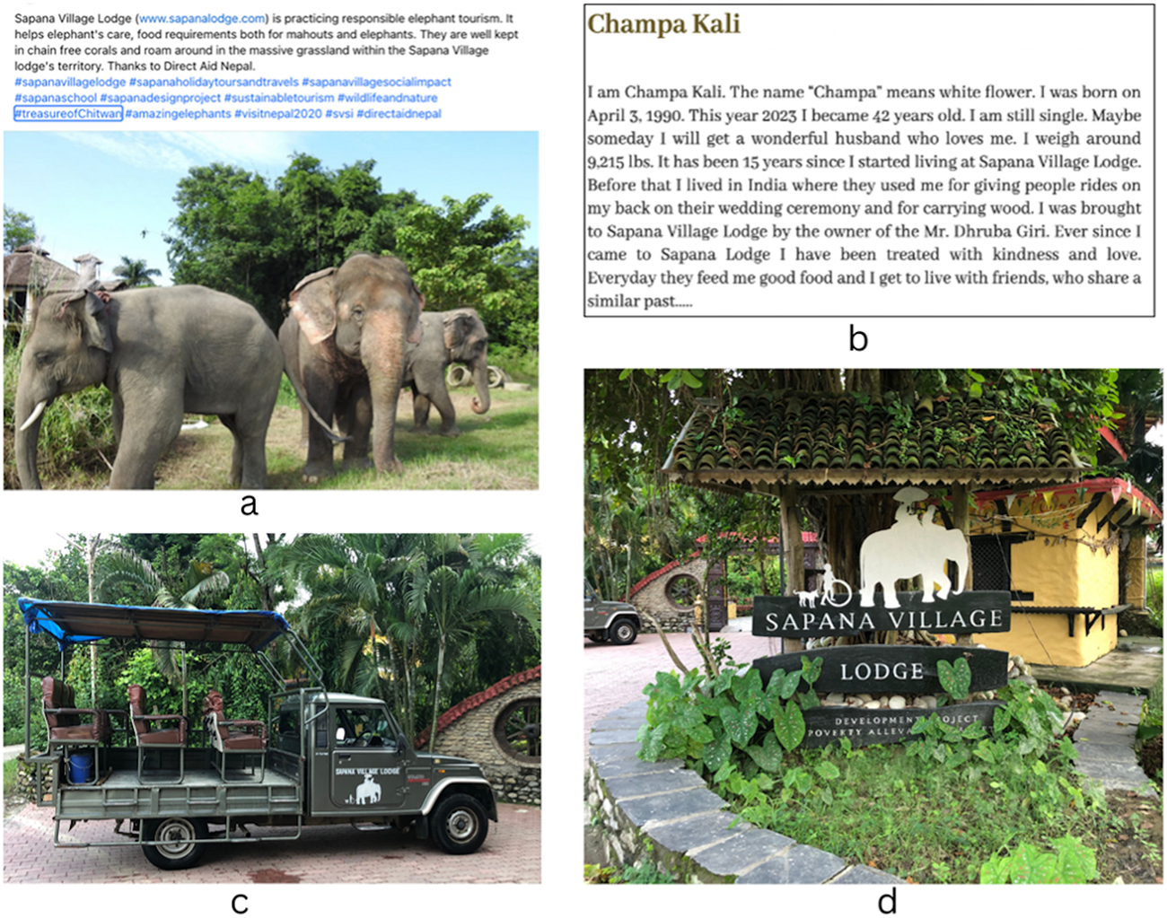 Figure 4. (a) Resort’s social media post; (b) testimonial on resort’s homepage by elephant; (c) resort’s logo on jungle safari vehicle; (d) elephant image on resort’s gate.