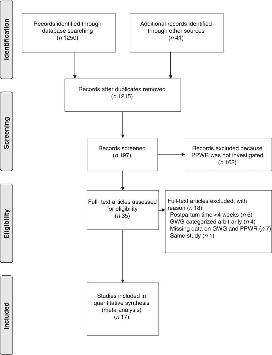 The trial flowchart is illustrated in Fig. 1. Electronic and manual literature searches yielded 1291 results, of which seventy-six articles were excluded because of duplication. A total of 1018 articles were excluded after the preliminary screening performed by going through the titles and abstracts. A total of 162 articles were further excluded on the basis of the inclusion criteria. Thus, thirty-five full-text articles were screened for detailed evaluation, among which seventeen studies were excluded because of having too short a follow-up time (<4 weeks; six studies), the arbitrary categorization of GWG (four studies) and missing data on GWG and PPWR (seven studies). Two studies described the aspects of the same study, but only the study reporting the PPWR was used( Reference Kac, Benicio and Velasquez-Melendez 14 , Reference Kac, Benicio and Velasquez-Melendez 22 ). Thus, seventeen studies, two of which were obtained from reference lists, were included in the present meta-analysis( Reference Lowell and Miller 7 – Reference Begum, Colman and McCargar 19 , Reference Scholl, Hediger and Schall 23 – Reference Oken, Kleinman and Belfort 26 ).