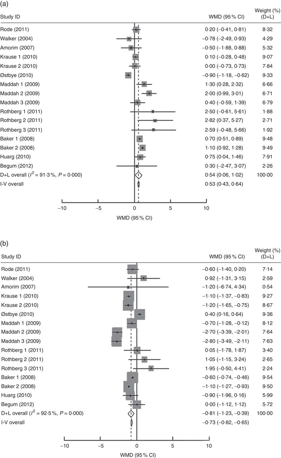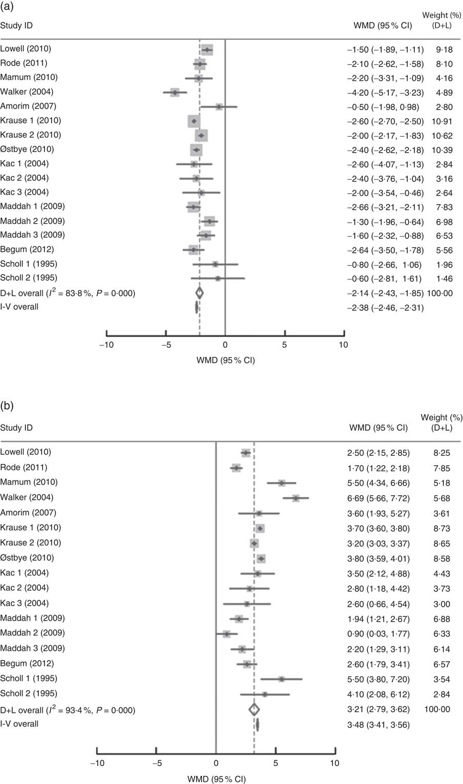 Fig. 2 Pooled estimates for the weighted mean differences (WMD, kg) of postpartum weight retention between women who gained below (a) or above (b) and within the Institute of Medicine recommendation for gestational weight gain. The study-specific WMD and 95 % CI are represented by the grey square and horizontal line, respectively; the size of the data marker (grey square) is proportional to the weight of the study in the meta-analysis. The centre of the open diamond presents the pooled WMD and its width represents the pooled 95 % CI