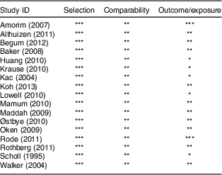 Methodological quality of studies was evaluated using the Newcastle–Ottawa Scale for assessing cohort studies used in meta-analyses( Reference Wells, Shea and O’Connell 21 ). A star was assigned where follow-up was a minimum of 1 year and where the loss to follow-up had been estimated for the study and reported in the article and where loss was less than 25 %. In addition, we conducted meta-regression analyses to assess specific aspects of quality such as time postpartum.