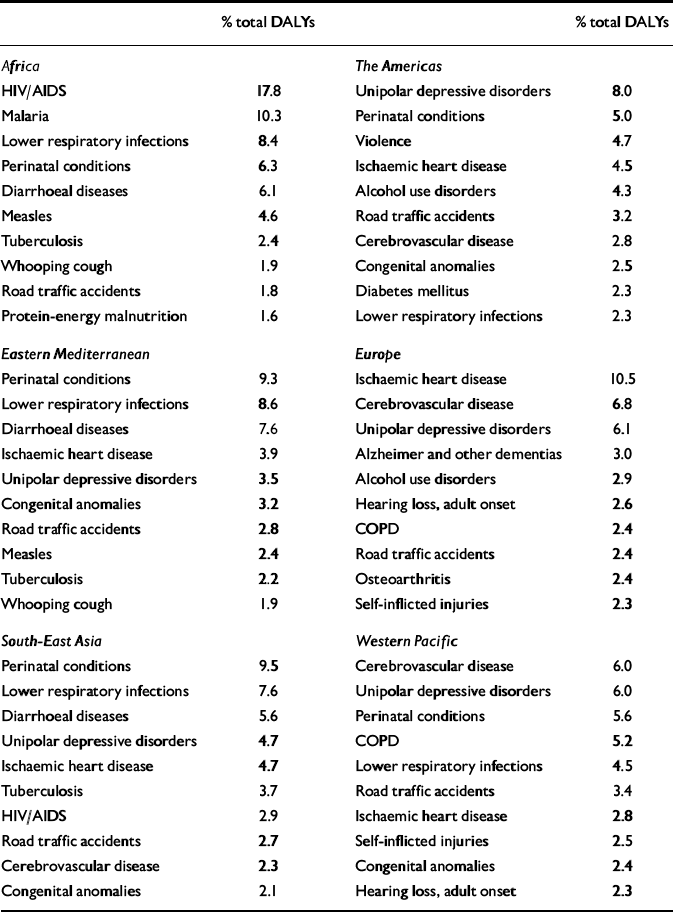 Table 4 Leading causes of disability-adjusted life-years (DALYs) in World Health Organization (WHO) regions, estimates for 2000