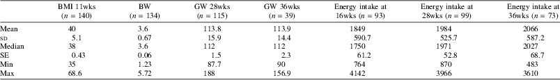Table 1 Maternal weight and birth weight characteristics with total energy intakes (kcals)