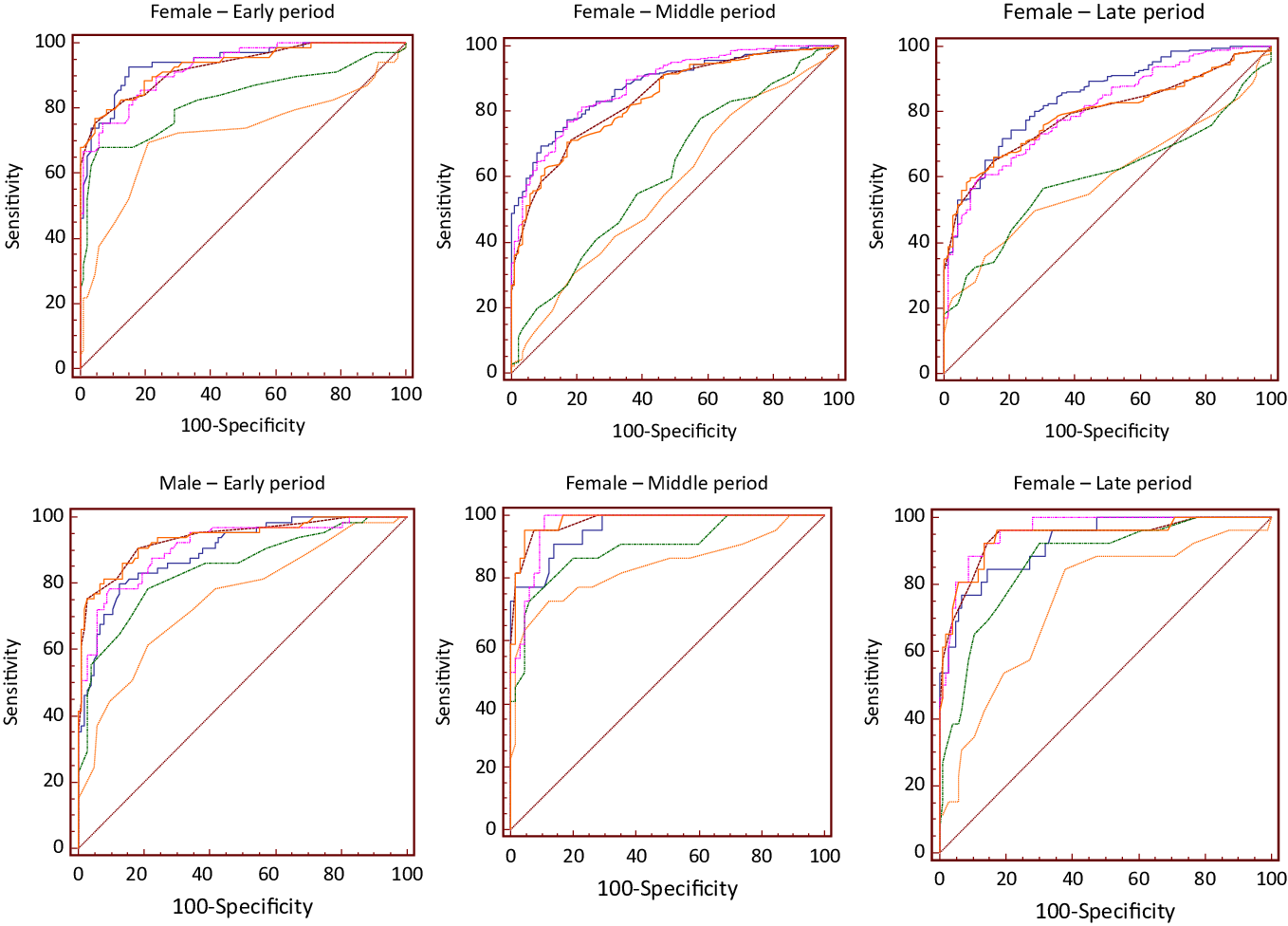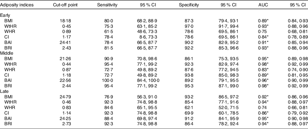 For males in the early period, WtHR and BRI showed better predictive capacity for body fat, with equal AUC value (P > 0·05). However, WtHR did not differ from BMI, BAI and BRI (P > 0·05), as well as BRI showed no difference for BAI and BMI (P > 0·05). BRI showed better capacity to predict body fat in the middle period, and it was similar to BMI, WtHR and BAI (P > 0·05). In the late, BAI showed higher value of AUC, being similar to BMI, WtHR, CI and BRI (P > 0·05) (Fig. 1).