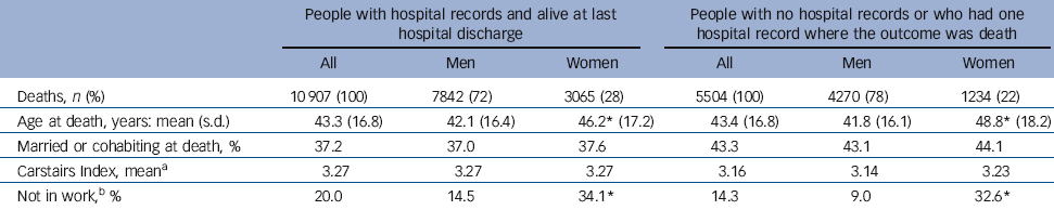 Comparison of people with and without previous hospital records revealed further differences (Table 1). Men had accessed secondary-care services less often than women (72% of deaths with previous hospital records were men, compared with 78% of deaths without previous records). In addition, people with hospital records had more frequently been living alone than those without such records (63% v. 57%) and higher proportions of men with records were not in work compared with those without records (15% v. 9%).