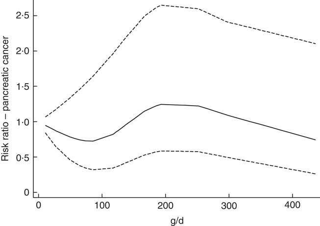 Fig. 1 Association between potato consumption (per 100 g/d) and pancreatic cancer risk. As estimated by a restricted cubic Spline regression model with four knots at fixed percentiles (5, 35, 65, 95, suggested by Harrell( Reference Harrell 45 )). Adjusted for sex, total energy (kJ), BMI, height, smoking status and stratified by country.
