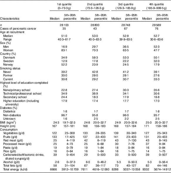 We excluded 2597 participants with prevalent cancer. The preliminary number of pancreatic cancer cases was 268. We excluded 539 participants, including one case, owing to implausible reported daily energy intake (lower than 2500 kJ for both sexes, and higher than 18 000 kJ for women and 21 000 kJ for men) and another twenty-seven (no cases) owing to implausible potato intake (>1 kg/d). As we included only adenocarcinomas from the exocrine pancreas, forty-four pancreatic cancer cases were excluded because they were neuroendocrine pancreatic tumours, lymphoma, carcinoid, malignant cell and malignant tumour. One case was excluded owing to missing information on cancer morphology. Further, we excluded 2494 participants, including one case, owing to missing information on smoking. Finally, thirty-six participants with follow-up time registered as zero were excluded, as they did not contribute to follow-up. Hence, 114 240 participants (38 766 men and 75 474 women) (Norwegian cohort: 33 690, Swedish cohort: 24 305 and Danish cohort: 56 245) were included in the final analyses. Of these, 221 (121 men and 100 women) were diagnosed with pancreatic cancer during follow-up.