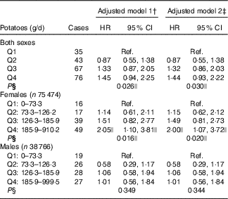The mean follow-up time was 11·4 (95 % CI 0·3, 16·9) years. Median age of participants in the quartiles of potato consumption was 52–53 years (Table 1). The cohort consisted of more women than men (66·1 % females) (data not shown), whereas slightly more cases were men (54·8 %). The Swedish sub-cohort had the longest follow-up (mean: 13·3 years), whereas the Danish sub-cohort was the largest (49 % of the participants), provided most of the cases (68·8 %) and had, on average, the oldest participants (results not shown in table).